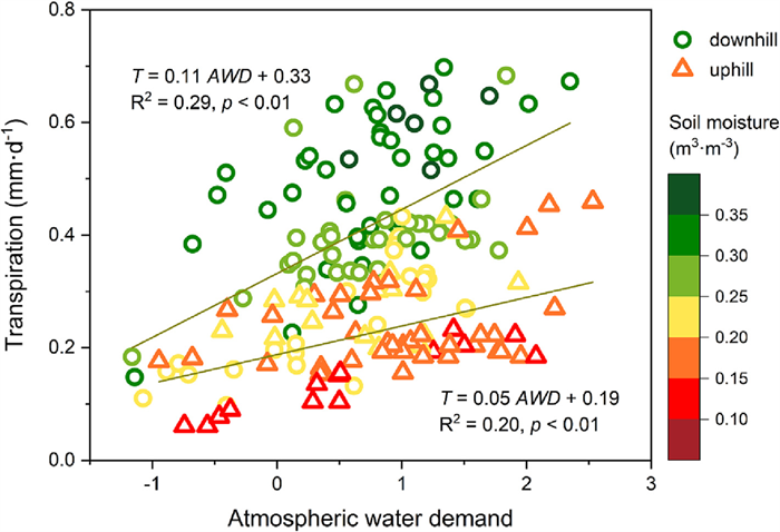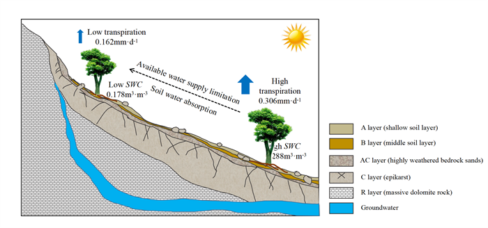 研究结果发现,上坡的土壤-表层岩溶带平均含水量为0.084~0.194m3 m-3,仅为下坡的45.3~69.8%左右,沿坡水分供应存在显著差异;上下坡盐肤木植物枝条水同位素相近,lc-excess偏负,结合MixSIAR模型分析可知,沿坡面盐肤木的吸水策略相似,均以利用0至60cm土壤水为主;上坡盐肤木蒸腾速率和蒸腾量降低至下坡的一半左右。下坡土壤水分相对充足,植物蒸腾随大气蒸发需求的变化而改变,上坡水分供应限制了植物蒸腾及蒸腾对大气蒸发需求的敏感性。本研究表明喀斯特地区自然恢复的次生植物蒸腾多依赖土壤水,且不能通过吸收深层水补偿由坡位效应引起的蒸腾差异。本研究进一步揭示出土壤水分仍是影响西南喀斯特土石混合生境演替初期植被恢复的限制因子,植物在上坡通过降低蒸腾的方式适应干旱环境。