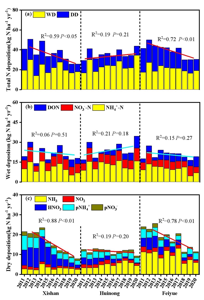 中国科学院亚热带农业生态研究所土壤生态与环境研究团队在位于湖南省长沙县的一个典型亚热带农业流域中的林地和连片稻田和茶园连续观测了2011-2020年10年间的大气活性氮浓度及其干湿沉降量,并探讨了不同活性氮组分沉降量的时空变化特征与成因。研究结果表明,10年间茶园(41.5-30.5 kg N ha-1)和林地(40.8-25.7 kg N ha-1)的大气氮素总沉降量均显著减少(p < 0.05),而稻田(29.3-32.9 kg N ha-1)的沉降量无显著变化。林地和茶园中总氧化氮沉降和还原氮沉降量均出现显著下降,与区域(湖南省)的总的氮氧化物排放下降以及育肥猪存栏量和农田总氮肥施用量下降相关。稻田氮沉降量无明显变化趋势主要与稻田大气氨沉降量十年间呈上升趋势有关,这可能与稻区土地利用变化(如单季稻改双季稻)导致的氨排放上升有关。