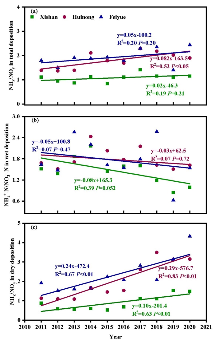 图2 十年间大气氮素年总沉降、干沉降和湿沉降中还原性与氧化性氮沉降量的比值变化