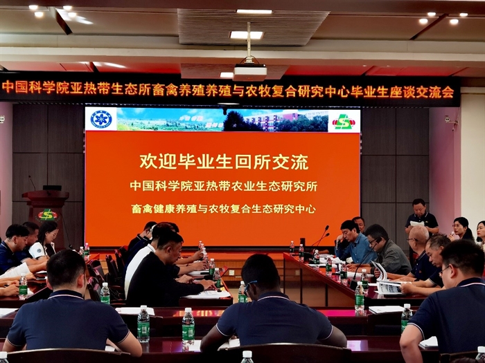 为更好地促进青年人才的学术发展,加强研究生之间的联系,交流最新的研究成果与行业进展,10月15日至16日,中国科学院亚热带农业生态研究所畜禽健康养殖与农牧复合生态研究中心召开研究生座谈交流会。亚热带生态所所长谭支良,原副所长王新洪,畜禽健康养殖与农牧复合生态研究中心印遇龙院士、中心主任孔祥峰研究员、中心副主任李凤娜研究员,所内相关部门负责人及往届毕业研究生、在读研究生等100余人参加座谈交流会。湖南农业大学贺建华教授和何俊教授出席,会议由孔祥峰主持。