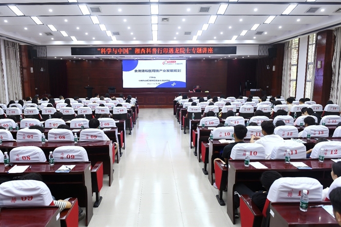 中国工程院院士、亚热带生态所印遇龙研究员在湘西民族职业技术学院和吉首大学分别作题为《食用猪和医用猪产业发展规划》《中草药与动物绿色生产体系构建》的科普报告,分享食用猪和医用猪产业发展现状、市场前景、发展瓶颈及有效解决路径,中草药在养殖中应用的历史,天然植物饲料在健康养殖中的应用,我国中草药资源发展问题及解决办法,中草药在养殖业应用的前景展望等内容。