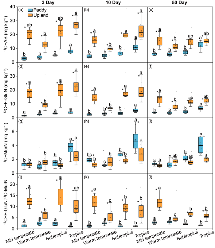 四个气候区稻田和旱地土壤13C标记微生物残体碳含量