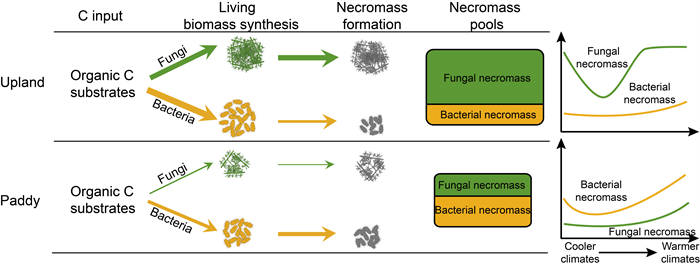 稻田和旱地微生物合成代谢及残留物形成机理示意图