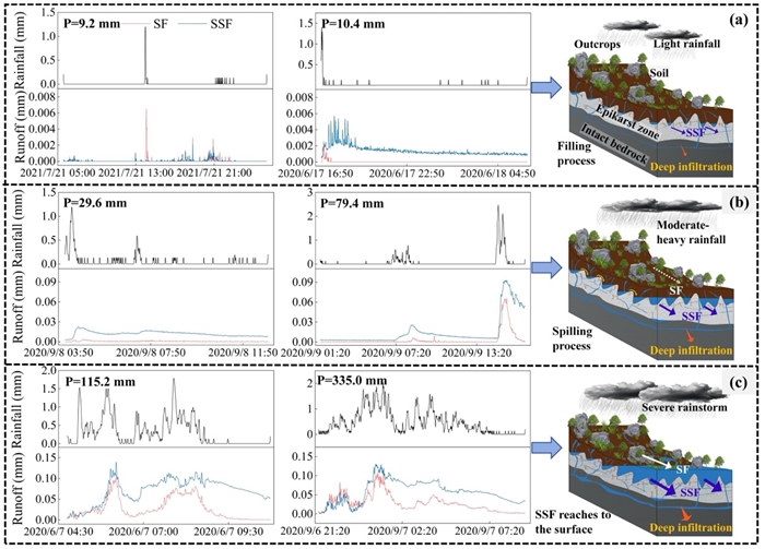 喀斯特山坡地表径流与岩土界面壤中流交互作用及其对降雨量的响应机制