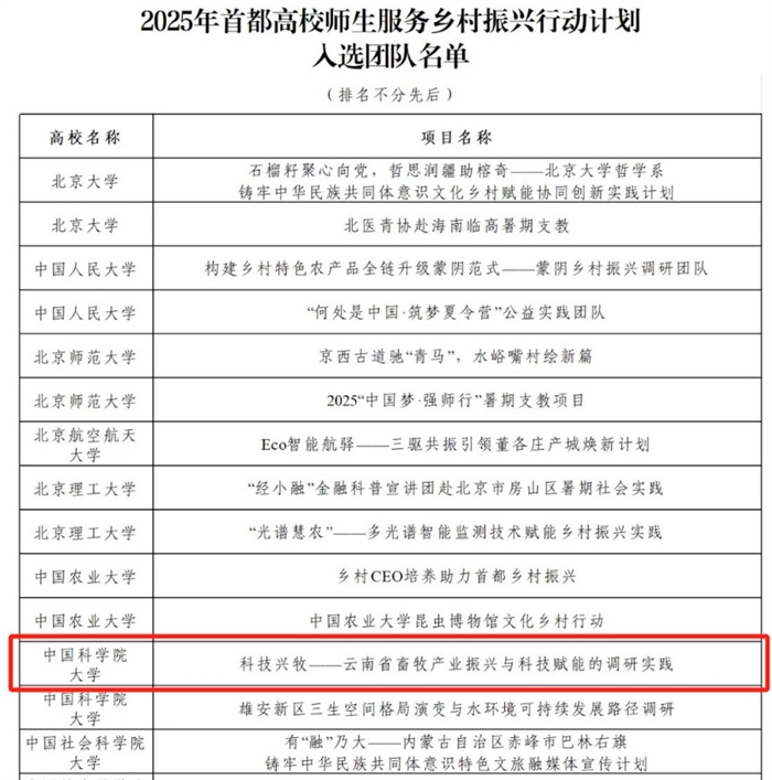 据悉,首都高校师生服务乡村振兴行动计划是北京市教工委为深入学习贯彻习近平总书记给中国农业大学科技小院学生重要回信精神,教育引导广大师生发挥智力优势,深入乡村一线,助力乡村振兴,上好特色“大思政课”,推动习近平总书记重要回信精神形成生动实践而设立的。中国科学院大学本年度共2个团队获批。