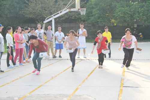 趣味运动中的“抢收抢种”吸引了很多师生甚至小朋友参加,运动员们捧着装有4个乒乓球的盒子,依次将球放进赛道沿途设置的4个杯中,跑到终点又迅速返回,依次将球捡起并放进盘中,跑回起点交给裁判时停止计时,用时少者获胜。老年人站起蹲下动作比较缓慢、手掌宽大的男生很难将手伸进杯子拿球、球放得太重又弹了出来……每个人都从观战中得到了快乐,参赛中得到了锻炼。而大部分的离退休老师都选择了参加“掷飞镖”游戏,老干们依次排队、秩序井然,即便在运动场中也处处透着温和与谦厚。“袋鼠跳”、“摸石头过河”等小运动也受到了很多女生的喜爱。