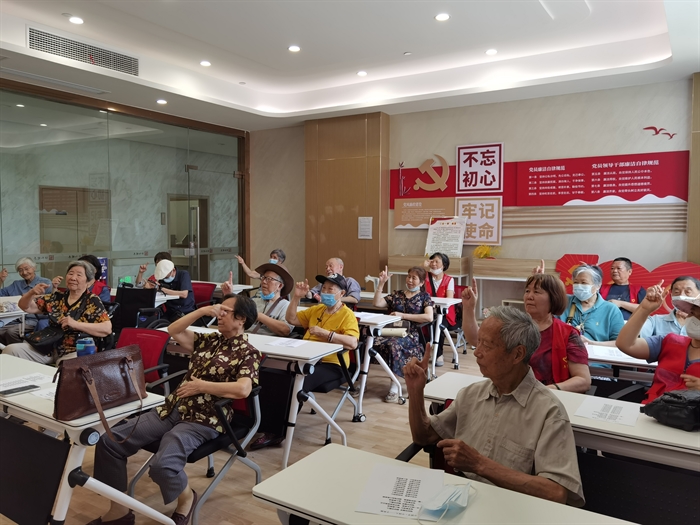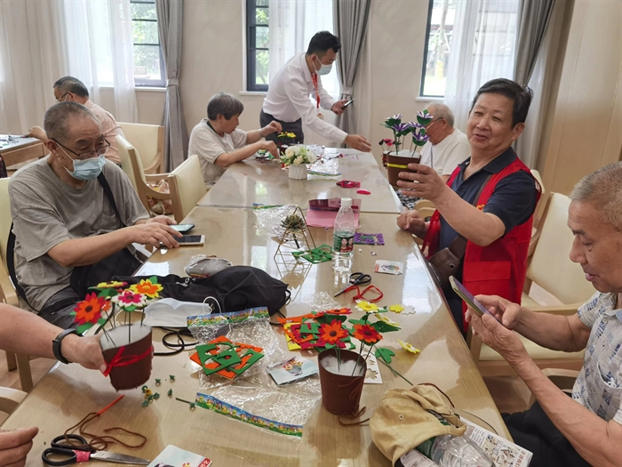 颐养院中十余位80多岁高龄的老同志,有的步履蹒跚、有的拄着拐杖、有的坐着轮椅,在志愿者们的帮扶下,大家一起唱红歌、跳手舞、做手工、观围棋、赏音乐,尽显童心未泯,其乐融融。