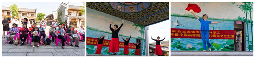 在渔窑小镇的戏曲舞台上,参加活动的老同志踊跃登台用歌声、诗朗诵和舞蹈等多种艺术形式庆祝中华人民共和国成立70周年和中国科学院建院70周年,讴歌对伟大祖国的热爱与祝福。老同志们精神焕发、载歌载舞先后表演了二重唱《祖国万岁》《红梅赞》《我们是工农子弟兵》,京剧《洪洋洞》《失街亭》《梨花颂》,诗朗诵毛主席诗词《沁园春雪》,太极扇,舞蹈《共和国之恋》和《我和我的祖国》等节目唱出了对伟大祖国、对中国共产党的深情厚爱,表达了老同志们“不忘初心、牢记使命”的坚定信念和昂扬向上的精神风貌。