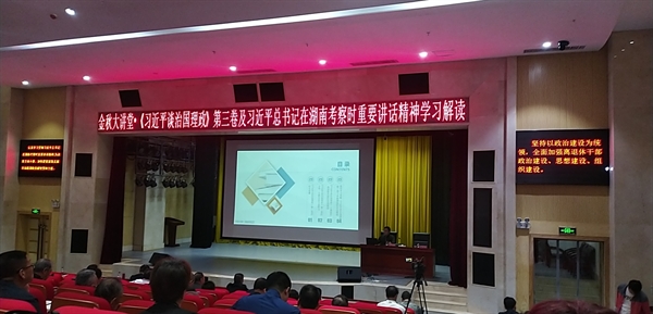 报告会邀请湖南省干部教育培训导师、中南大学博士研究生导师刘新庚教授作了题为“习近平谈治国理政第三卷和习近平考察湖南的重要讲话学习导读”的报告。报告从《习近平谈治国理政》第三卷的时代背景、主线主要内容与创新点、湖南传承创新发展的思想解读、如何学习贯彻《习近平谈治国理政》第三卷与考察湖南的讲话精神等四个部分进行了深入浅出的解读。