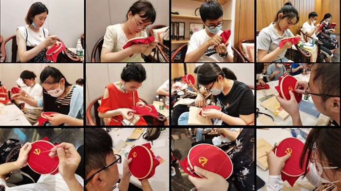 在博物馆内,讲解员声情并茂地向青年党员介绍了湘绣博物馆里的珍奇绣品,大家在历史悠久的楚湘之源中感受刺绣的惊艳;在绵延不绝的民间刺绣中体会古人的智慧和创造,体会针尖上的湖湘之盛之美之梦。全体党员佩戴党徽合唱国歌并重温入党誓词。在学习党旗历史的同时,大家在老师的指导下学习刺绣技艺,党员们在各自的党旗前,指尖翻飞,眼神专注。