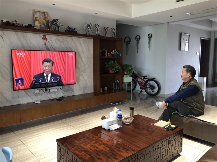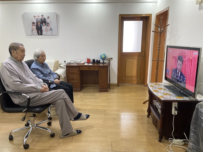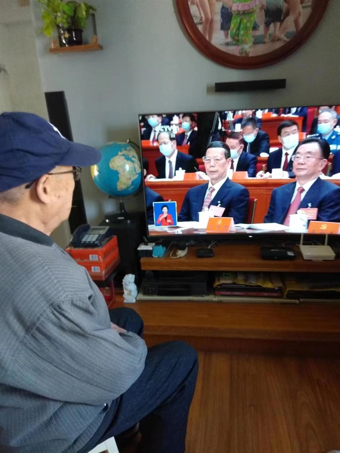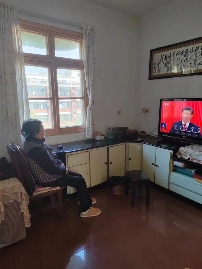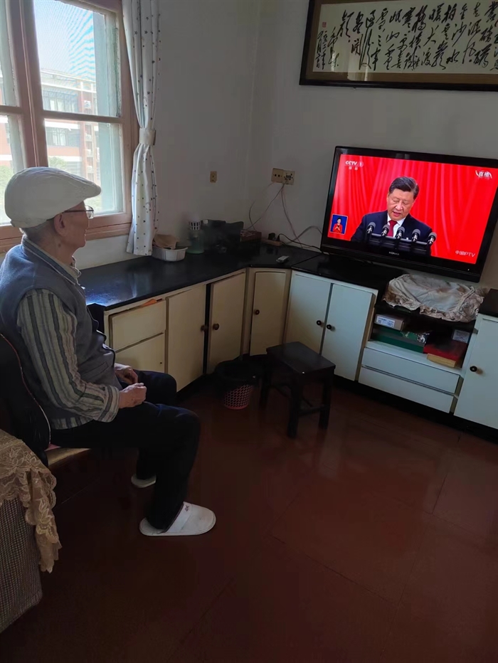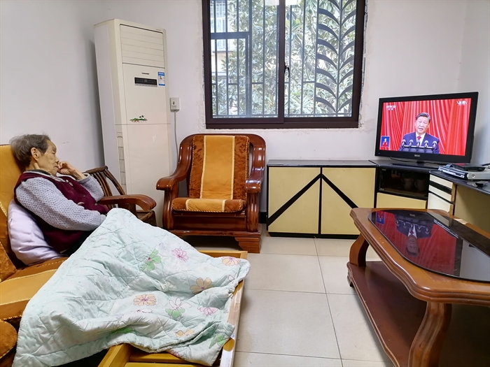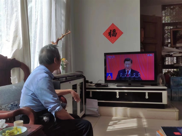 九十三岁高龄的刘玉桃老人行动不便,依然坚持斜卧在沙发上观看开幕直播;刚过九旬的项国荣、吴铎夫妇用过早餐,早早端坐在电视机前,认真的像一对上课的“小学生”;成瑞珊老夫妇从代表通道入场至直播结束后仍意犹未尽;陈玮老师在医院病房照顾生病的爱人也不忘准时收看直播盛况。