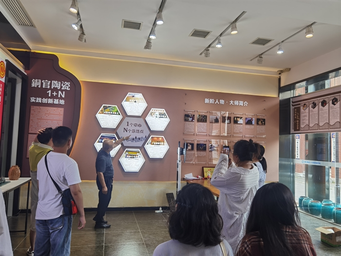 铜官是唐代陶瓷文化重要承载地,也是世界釉下多彩陶瓷发源地。首先组织大家观看了铜官古镇宣传片《陶城印象》,参观了铜官窑博物馆、谭家坡遗迹馆和陈家坪遗址,体会藏在瓷器里的长沙历史文化特质以及古代长沙劳动人民生活情景,感受千年陶城生生不息的力量。随后,大家在铜官陶瓷行业协会秘书长苏建伟的带领下,参观了铜官陶瓷“1+N”实践创新基地,聆听《实现铜官陶瓷振兴》微党课,感受铜官陶瓷的创新性发展,并近距离观摩学习制陶的基础技艺,亲身体验制陶乐趣和陶艺之美。