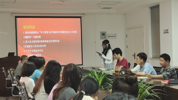 首先,全体党员观看侯建国院长“学习贯彻习近平新时代中国特色社会主义思想主题教育”专题党课视频。支部书记叶冬煦结合研究所开展主题教育的情况和研究生实际,传达了所党委会的有关要求,介绍了相关进展情况。