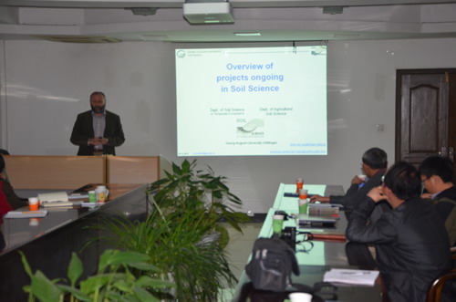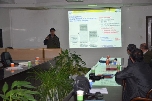 访问期间,Yakov Kuzyakov与徐兴良就C、N循环、根际激发效应、植物–土壤–微生物互作、全球变化等领域的最新研究进展与该所研究人员及青年骨干和研究生作了深入的交流和探讨,并分别作了题为“Overview of projects ongoing in Department of Soil Science of University of Goettingen”, “Tracer approaches and labeling for processes’ tracing in ecosystems”和“Position specific labeling – a new tool for tracing soil C”以及“Priming Effects:effects of the addition patterns and temperature”的学术报告。报告内容引起了参会人员的强烈兴趣并展开热烈讨论。