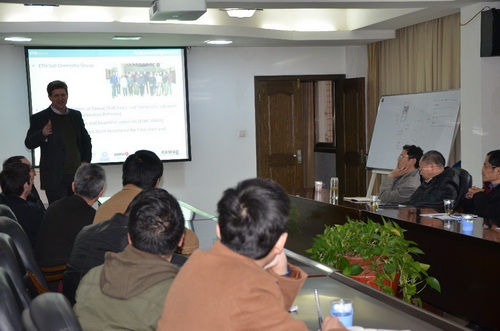 访问期间,Kretzschmar作了题为Dynamics of trace metal speciation and solubility in contaminated soils的学术报告。报告详细介绍了Kretzschmar团队围绕土壤中痕量元素环境地球化学行为及其机制方面所取得的成果和目前正在开展的研究工作。报告内容引起了参会人员的强烈兴趣并展开热烈讨论,同时,他们耐心回答了提出的问题。