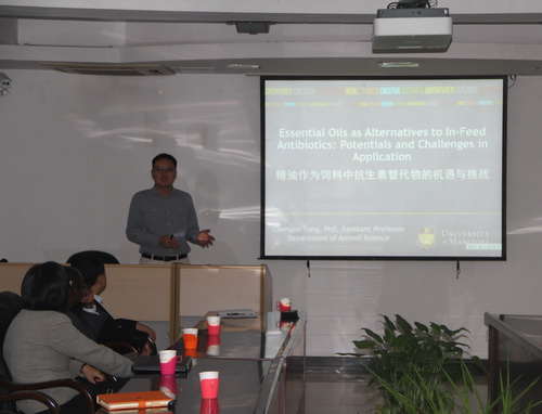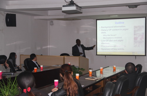 Karmin O作了题为Impact of oxidative stress on health and disease的学术报告,她对实验室进行药物研发的思路进行了介绍,包括:植物活性物质提取→活性成分分析→细胞和动物模型检验→毒理学检验→临床实验,并以实例探讨了盐酸小檗碱和叶酸对高脂饮食引发炎症的缓解作用,这些研究成果随后也在动物营养领域得到广泛应用。Martin作了题为Dietary crude protein content as a risk factor for piglet diarrhea的报告,介绍了猪日粮蛋白质水平对肠道微生物活性和微生态平衡的影响,探讨了低蛋白日粮降低猪肠道有害菌数量、促进有益菌生长的作用,同时减少腹泻,并对低蛋白日粮模型的建立提出指导性建议。最后,欧阳博士进行了简短的介绍性报告,他曾经在亚热带研究所学习,目前已在曼尼托巴大学建立了自己的实验室,承担的课题方向包括:肠道化学感受器的研究、抗生素替代物的研发、营养物质转运载体的研究、活性物质鉴定和代谢性疾病的控制等,并欢迎亚热带所的研究生前往其实验室进行学习与深造。