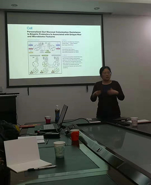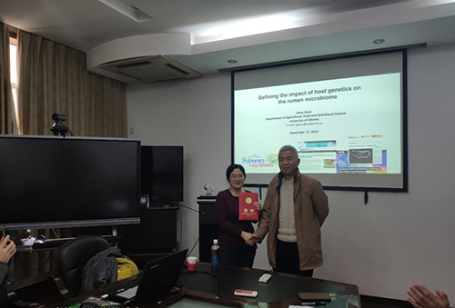 首先,谭支良为Leluo Guan颁发了中国科学院亚热带农业生态研究所兼职研究员聘书。交流会上Leluo Guan就反刍家畜与微生物间的关系作了题为Defining the impact of host genetics on the rumen microbiome的学术报告。详细介绍了她们团队在反刍家畜日粮与瘤胃功能、饲料与瘤胃微生物的个性化变化关系、瘤胃微生物与生产性能间的关系、动物遗传因素对瘤胃微生物组的影响、瘤胃微生物与饲料效率及甲烷减排等方面的研究进展。同时就如何从实验设计、如何分析动物胃肠道微生物组数据并撰写高水平科技论文,瘤胃微生物及其功能与关键营养素代谢间的关系、双方联合开展科研合作及研究生培养等方面与谭支良研究员及相关科研人员进行了详细讨论和交流。