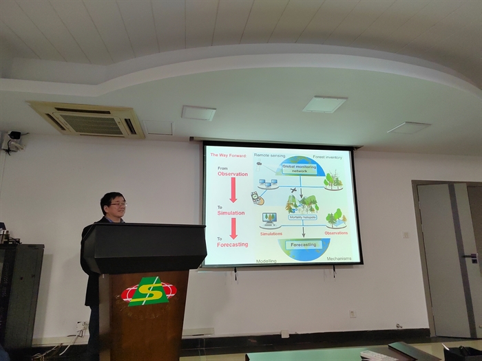 会上,彭长辉作了题为Understanding and predicting the consequences and feedbacks of vegetation browning cross forest ecosystems的学术报告,介绍了开展“browning”(枯黄化)研究的科学与现实意义、加拿大北方森林枯黄化时空格式、针对枯黄化模拟与预测的TRIPLEX模型完善以及下一步的工作设想等。同时就森林枯黄化现状与模拟预测、机制研究与模型整合与发展、科研合作等多个方面与亚热带生态所科研人员开展了交流讨论。