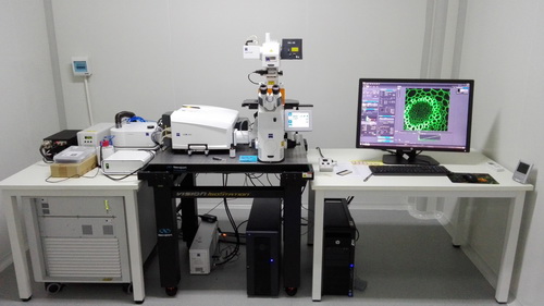 激光共聚焦扫描显微镜(LSM880)是蔡司公司2014 年 7 月推出的最新款激光共聚焦扫描显微镜,拥有高灵敏度、高分辨率和快速等特性,设备配置及特点:1)配有四激光器六条谱线(405 nm、458 nm、488 nm、514 nm、543 nm和633 nm),可以用于观察DAPI、CFP、GFP、YFP、FITC、TRITC、Rhodamine、CY5、R-Phycoerythrin、APC等常用染料。2)配备2个PMT检测器和1个超高灵敏度探测器,对极弱荧光信号或者单分子荧光信号可进行检测。采用液态制冷技术能保证探测器更高的灵敏度,更高的信噪比。3)扫描振镜:采用独立式、高速双镜扫描。扫描方式为线性扫描,提供包括单向以及往复式两种,每种方式下其扫描速度应提供19档的选择;高质量扫描同一套扫描震镜面扫描速度在512 × 512时13幅/秒,256x256时27幅/秒,512 × 16时430幅/秒,38种速度选择;线扫描速度在每线512像素的情况下,线扫描速度6875线/秒。可用于捕捉快速变化的荧光信号。可实现的实验有:①.可溶蛋白的高速FRAP实验 ②.快速粒子追踪:如钙火花③.病毒、细菌等对细胞的入侵 ④.膜蛋白的运动等。4)活细胞培养系统:能够长时间观察并记录活细胞的生理变化过程。配备了CO2孵育装置,细胞可以在特定CO2浓度(5%)、适宜的温度(环境温度—60℃)、及适宜的湿度环境下生长观察。5)购置了FRET、FRAP、光谱拆分、定量分析、离子浓度测量等软件,能满足不同的科研需求。FRAP:即荧光漂白恢复。可以实时检测蛋白质在活细胞内的运动、转运、核浆穿梭、膜/核转位等。FRET:即荧光能量共振转移。可以原位检测蛋白质、核酸在固定或活细胞内的相互作用。