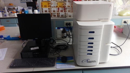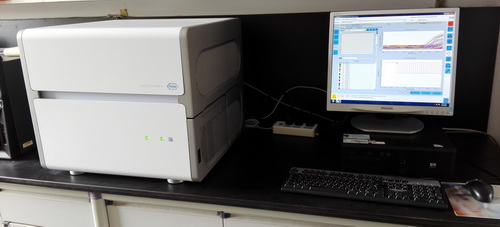 核酸蛋白分析仪(Fragment Analyzer 96)是由美国AATI公司研发生产的新型突变检测及核酸片段分析系统,该仪器的主要应用包括:TILLING平台突变检测、高通量SSR检测、二代测序中NGS片段文库的质控、基因组DNA分析、总RNA/mRNA定量、SNP检测以及CAPS、RAPD、AFLP检测等。仪器采用荧光检测和毛细管电泳原理,可快速高通量分离不同长度的双链DNA或RNA片段,系统检测分辨率高(分辨率高达2bp);精确度高(片段长度分析误差≤5%);灵敏度高(检测最低浓度可达5pg/ul);分析通量高,可一次检测12或96个样品,最多为288个样品;分析时间减少,PCR产物可直接上样,无需进行预处理;运行快15min内完成700bp片段分离。