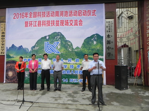 秉承“普及科学知识,弘扬科学精神,提高全民科学素养”的使命,围绕2016年“科技创新 追梦未来”全国科技活动周与中国科学院第十二届公众科学日的活动主题,中国科学院亚热带农业生态研究所环江喀斯特生态系统观测研究站与河池市人民政府、河池市科学技术局、环江县人民政府,于5月14日在环江毛南族自治县水源中学联合开展“2016年全国科技活动周河池活动启动仪式暨环江毛南族自治县科技扶贫现场交流活动”。河池市副市长韦祖林,河池市科技局局长韦懿格,环江县委副书记、县政协主席谭勉,环江喀斯特站常务副站长/环江县委常委、副县长曾馥平出席、参加启动仪式。河池市、环江县两级科技领导小组成员单位及水源镇党委、政府领导,镇直单位以及广西蚕业推广总站、河池学院研究站专家、科技特派员代表、环江喀斯特站科普志愿者和社会群众近1000多人参加启动仪式。