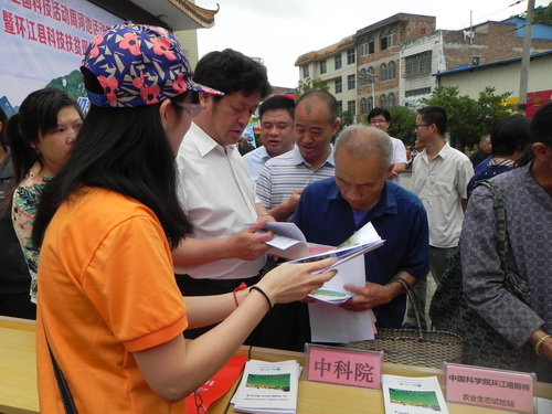 据统计,启动仪式当天,参加活动的环江喀斯特站以及市、县两级科技领导小组成员单位共发放各类科普资料及科普书籍10000多份(册),为群众提供科普咨询400多人次,并为200多名群众开办了农村技术培训班,培训班邀请了专家为前来参加活动的群众分别讲授了种桑养蚕与种植红心柚实用技术。