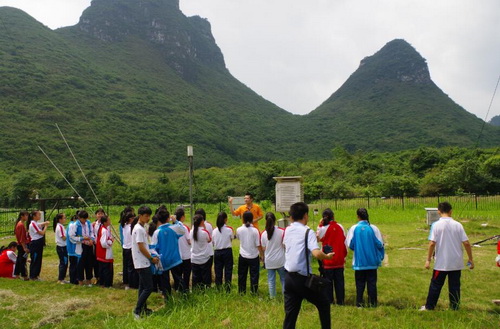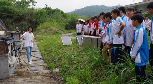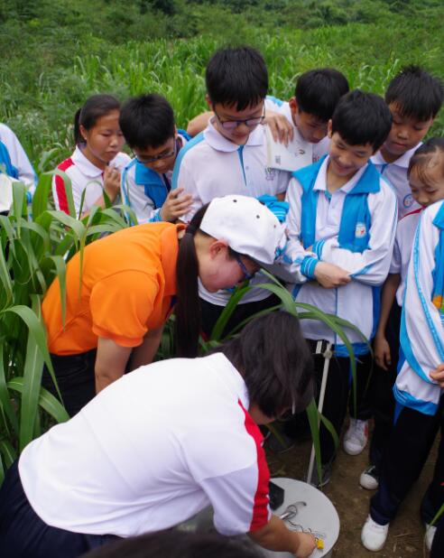 5月18日,环江站组织驻站研究生会为主体的科普志愿者,开展了“中学生科普开放日”活动。环江县第三中学三十余名学生会代表,在副校长卢云、办公室主任吴江建、团支部书记胡晓提等老师的带领下,参观了环江站木连综合试验区。科普志愿者们分别向来访师生介绍了环江站的发展历史、站内科学家在“喀斯特峰丛洼地脆弱农田环境的生态重建”的科研示范成果,并引导他们参观了喀斯特坡地植被-土壤-表层岩溶带三维水土过程监测小区、木连流域多尺度生态水文监测试验场、耕作干扰与碳氮循环实验小区、外源氮输入与人工草地碳氮循环实验场、气象观测场等野外试验场地,与中学生们互动体验了外源氮输入与人工草地碳氮循环实验场的土壤N20气体样品的采集操作。卢云表示,此次科普开放日活动给初中学生们一个感受喀斯特区域生态学魅力的机会,这将有助于提高孩子们对生物、地理等科学知识学习的热情和兴趣;并希望环江站的科普志愿者今后能走进校园,开设科普课堂,向更多的在校学生传播喀斯特区域的生态学知识,提高学生们的生态学素养与环保意识。