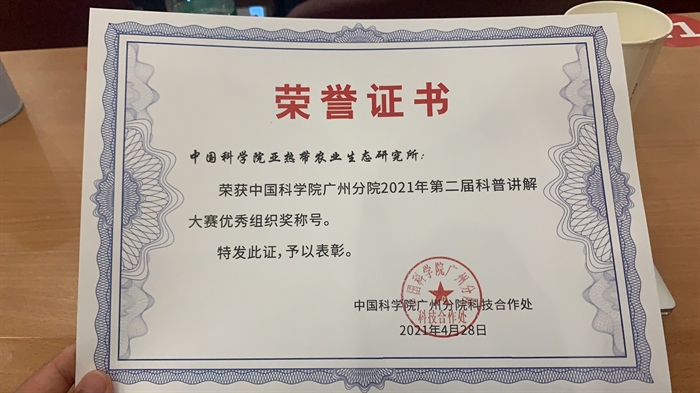 4月28日,中国科学院广州分院第二届科普讲解大赛在广州举行,来自分院系统8家单位的37名选手进行比拼。经过一天的激烈竞争,中国科学院亚热带农业生态研究所博士研究生刘铭羽荣获二等奖,博士研究生张灵煜荣获优秀奖,研究所荣获优秀组织奖。