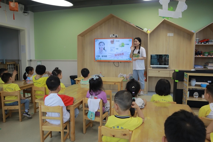 你们觉得家里做菜用的醋是酸性还是碱性呢?这里有两杯透明的液体,分别是矿泉水和白醋,在不用嘴尝的情况下,你能用通过pH试纸知道哪一杯是矿泉水,哪一杯是白醋呢? pH试纸遇上柠檬汁,会变成什么颜色呀? pH值小于7是酸性还是碱性呀? 活动现场,来自亚热带生态所的赖佳鑫博士以《果汁酸碱知多少》为题带着小朋友开始了科学之旅,让小朋友了解水果汁与常见液体的酸碱性是有区别,生活中常见的水果口味,观察水果表皮的颜色与果肉的颜色,如何使用pH试纸测定果汁的酸碱性和生活中常见液体的酸碱性。