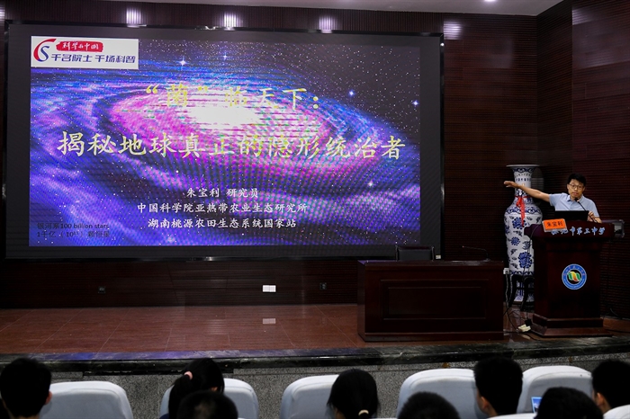 朱宝利研究员在怀化市第三中学作题为《“菌”临天下:揭秘地球真正的隐形统治者》的科普报告。他在报告中介绍,在与人类文明的交汇中,微生物扮演着双重角色,它们既是肠道健康的隐形指挥官,又是生物技术革命的灵感源泉,也曾以黑死病等瘟疫事件深刻改写人类历史。未来,从微生物燃料电池到利用蓝藻进行太空生态系统构建,这些“微观工程师”有望引领能源革命与星际生存。