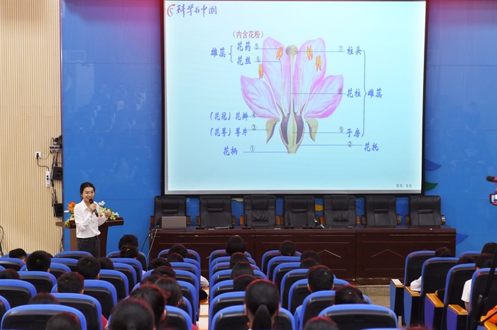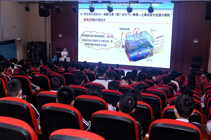 在怀化市金时中学,袁红朝正高级工程师作题为《双刃剑:小小元素的大能量》的科普报告,元素作为物质的基本单位,其微观能量既可推动文明,也可能引发危机作为,报告还回顾一批杰出科学家以爱国奉献、自主创新精神,助力中国核能事业崛起的故事;张浩研究员作题为《石漠化:土地的“石化”之谜与绿色复苏计划》的报告,介绍了我国南方石漠化分布情况及危害,剖析自然与社会成因,并从生态移民、植被复合经营、生态产业等方面展示石漠化治理成效。