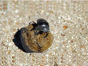 在偏僻的农村,猪、狗以及大的牲口都会在室外饲养,蜣螂也就随处可见。只要有一处新鲜的粪便,用不了多久就会招来蜣螂。蜣螂有一定的趋光性,能利用月光偏振现象进行定位,以帮助取食。它们在粪便中心打一个洞下去,挖出一堆新土来,住了进去,慢慢享用美餐。它们不仅自己食用,还会弄去给孩子做食物,一般是两只蜣螂一前一后,雄的在前面拉,雌的在后面倒着推一个比自己身体还要大的粪球,滚得溜圆。很像是一对勤快的夫妻,要把所有的粪便都弄回自己家里去。两只体长10毫米的蜣螂合作工作,在30-40小时内,就可把100克牛粪滚成直径2.5厘米左右的粪球,迅速推到地下埋藏起来,用作下一代的食粮。而牛粪上蝇子产的卵,要96小时后才能孵化为幼虫。蜣螂抢先了一步,此时牛粪早已埋入地下,蝇卵再也孵不出幼虫了。牛粪被蜣螂埋到地下,即清洁了地面,还可以改善土壤结构,增加土壤的通透性,因此,蜣螂扮演的就是这样一个清道夫的角色。