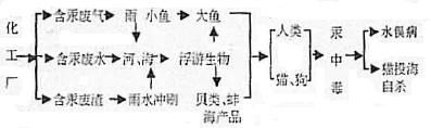 长期以来,猫跳海自杀和狂怒病的病因一直是个谜。后来在经过临床病理和动物试验等多方面的研究,才发现这种现象与有机汞(甲基汞)污染水体环境有关。原来在水俣镇有若干生产氯乙烯和乙醛等化工产品的工厂,制造工艺中需要有机汞盐作催化剂,工厂将含汞的工业废水直接排放到水俣湾水域中,致使水体产生严重的汞污染。进入水中的无机氯化汞经过微生物的作用逐渐转化为有机汞,在鱼类和水生生物中富集。当地的猫和狗吃了大量的鱼虾食物,当地的居民也爱吃鱼虾和贝类等海产品,由此污染的汞就随食品进入人体和动物体内,最终发生上述病症(见下图)。