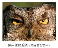 鸮(xiāo,枭),系鸮形目(Strigiformes) 夜行性肉食性猛禽,俗称猫头鹰,民间也称 “夜猫子”。多数鸮头部宽圆,脸部扁平,眼周的羽毛呈辐射状,细羽罗列形成脸盘,面形似猫。喙坚强而钩曲,嘴基被有蜡膜,且多被硬羽掩盖。由于特殊的颈椎结构,脖子能灵活转动,脸可转向后方,头的活动范围达270°。它们对夜间捕食生活高度适应,两眼大而圆,瞳孔很大,视网膜中的视杆细胞丰富,对弱光也有良好的敏感性,有反光色素层,可在夜间视物,在漆黑的夜晚,能见度比人高百倍以上。其双目向前,视区重叠,可分辨距离。眼中有3张眼睑,上眼睑会于眨眼时放下,下眼睑会于睡觉时盖上,而中眼睑是一线状组织,会上下移动清洁眼面。大部分鸮的耳孔周缘具耳羽簇,利于收集音波。硕大的头使两耳之间的距离较大,可以增强对声波的分辨率。左右耳不对称,左耳道更宽阔且有发达的耳鼓,在捕捉同一声音时可产生细微差别,能极其准确地测定猎物的立体方位,可根据猎物移动时产生的响动,不断调整扑击方向,对准后出爪,一举奏效。内耳大,脑部的听觉神经很发达,体重300克的仓鸮约有9.5万个听觉神经细胞,而体重600克的乌鸦却只有2.7万个。尾短圆,周身羽毛稠密而松软,通常为暗褐色,散缀细斑,飞行时无声且不显形,白昼栖息时也不易被发现。腿强劲有力,多数全部被羽,夜间捕食时可减弱噪声并御寒;爪强锐内弯,第四趾能向后反转利于抓、攀。鴞的这些体形与机能特点,特别适合捕捉好夜间活动、机灵狡猾的鼠类,从而成为鼠的劲敌。