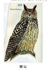 雕鸮Bubo bubo:体型硕大(69厘米),体羽褐色斑驳,胸部片黄,多具深褐色纵纹。耳羽簇长,橘黄色的眼特别显大。嘴灰色,脚黄色,尾短,翼宽。叫声沉重。栖于有林山区,营巢于岩崖。飞行迅速,振翅幅小。其猎物主要是农田、草原和林区的鼠类。广布于欧亚大陆,我国泛见于除海南和台湾以外的大部地区,为各地常见种但皆数量稀少。