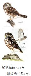 纵纹腹小鸮Athene noctua:体小(23厘米),无耳羽簇。头顶平,眼亮黄而长凝不动。浅色平眉及白色宽髭纹使其形狰狞。上体褐色,具白纵纹及点斑。下体白色,具褐色杂斑及纵纹,肩上有2道白色或皮黄色横斑。虹膜亮黄色,嘴角质黄色,脚白色、被羽。为常见留鸟,广布于中国北方及西部的大多数地区,高可至海拔4600米。部分地昼行性,常立于篱笆及电线上,会神经质地点头或转动,有时以长腿高高站起,或快速振翅作波状飞行。好日夜发出占域叫声,拖长而上扬,音多样。