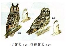 短耳鸮Asio flammeus:中等体型(38厘米),耳羽簇短小而在野外不可见。整个外形与长耳鸮十分相似,但体色较淡。上体黄褐,满布黑色和皮黄色纵纹;下体淡色有十字形黑褐色纹。下胸及腹部细纹比长耳鴞要多。飞行时黑色腕斑显而易见,并发出“kee-aw”的吠声,似打喷嚏。虹膜黄色,嘴深灰,脚偏白。栖于平原、耕地、草原等处,喜有草的开阔地,昼间常可见于平原或沼泽地带,平时潜伏于草丛间,夜间觅食;以食啮齿类为主,夜捕鼠,昼食昆虫。繁殖于中国东北,越冬时遍及全国海拔1500米以下的大部分湿润地区。