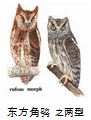 东方角鸮Otus sunia:体长19厘米,是中国体型最小的鸮之一,具“典型”猫头鹰形象:头大、脸圆、眼炯,一双“耳朵”直立(特大的耳羽簇是“角鸮”之名的来源,不过平时它并不竖立,只有在情绪激动或受威胁时才会显现出怒发冲冠的样子)。全身褐色斑驳,胸满布黑色条纹,条纹于下体多而上体少,在肩部有一列比较大的羽毛梢部有浅色的大斑,使其在翅膀收起时背上出现一个浅色的V字。有棕色型与灰色型之分,曾被当作红角鸮Otus scops的亚种。虹膜橙黄色、瞳孔呈深棕色到黑色,是其区别于其它常见角鸮的特征。嘴-角质灰色;脚-偏灰。通常栖于山地,好在树洞、墙洞等凹陷处筑巢繁殖,在林缘、林中空地及次生植丛的小矮树上活动,白天大多数时候都呆在树荫深处,晨昏和夜间出来捕食大型昆虫和小型啮齿类。其鸣叫声独特——每年4月中旬开始,它那种十分空灵的“Tuntun-tun”鸣声就会回荡在很多地方,每度鸣叫大约能持续5、6秒钟,稍微停顿片刻又马上开始,有时候能持续一个晚上。在我国为常见留鸟,指名亚种分布在西藏东南部;亚种stictonotus在东北及华东长江以南;malayanus在华南、西南及东南包括海南岛和台湾;japonensis偶见于台湾。