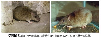 2张褐家鼠彩照显示其体躯、四肢及尾都粗壮,尾两色,耳朶较小。