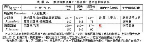 我国分布的鼯鼠类中,还有鼯鼠属的灰鼯鼠和海南鼯鼠也是中国特有种,其基本生物学资料汇总于表 鼯-2b。