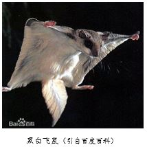 黑白飞鼠Hylopetes alboniger(Hodgson,1836):别名黑白林飞鼠、箭尾黑白飞鼠、黑白鼯鼠,英语名Particoloured flying squirrel。身体比飞鼠大,尾、后足和耳也较长。体长18~21厘米,尾比体略短。体背面淡褐色;皮翼背面外缘从腕至臀黑色,由腕向后有一白色边缘;耳内外均覆有细短黑毛;体和皮翼的腹面均为白色;颏和喉及腋下纯白色;前足暗灰色,后足足趾白色;尾毛柔软,尾形宽扁,上面烟灰色,下面基部两侧浅黄色,中间略较深暗,尾端黑色。