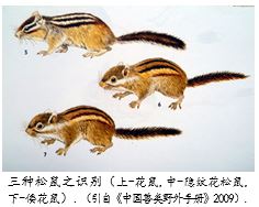 倭花鼠 Tamiops maritimus(Bonhote,1900):别名倭松鼠,英文名Maritime Striped Squirrel。背毛短,呈橄榄灰色;腹毛淡黄色;侧面的亮条纹短而窄,呈暗褐白色,中间的两条亮条纹模糊,侧面一对较清楚,但不像明纹花松鼠那样明显,眼下面的灰白色条纹不与背上其他亮条纹相连。该种区别于隐纹花松鼠的特征是,体型更小、毛被较短而绒细、体背部橄榄色调较浓,其内侧的淡色纹更接近于颈背部色调。