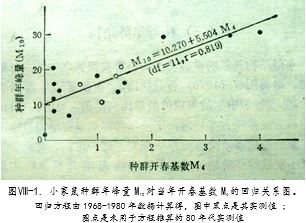 但使用时须注意,各指标本身也会受别的因素干扰而失准。例如图Ⅷ-1左侧各实测点很分散,就是意味着M4<0.5时种群消长更多地取决于其他因素。历年调查中观察到,M4调查之前段时期若气温特低,房舍区过冬的小家鼠会推迟外迁,若气温偏高则提早外迁,从而可影响M4的大小,使之不能确切反映开春种群总体的实际数量水平。最典型是1976年,该年4月上旬特寒,该中旬测M4仅0.16,远低于其70年代平均值(1.28),依图中所示一元回归方程计算,该年年峰量M10将仅达11.15,为“低数量级”;但该年实际越冬存活鼠并不少,到6月中旬测M6就有2.39,超过十年均值(2.23),实测该年M10=20.93,是中数量级最高的。这就是因为更多个体是4月中旬之后才由房舍里迁出之故。此例突显了综合考虑各因素的必要性,不可仅凭单个因子(M4)预测M10。再就是取样量也会影响测得指标的准确性,特别是涉及比例的,例如怀孕率、壮龄比及雄性比等,若总取样数太少,计算出的误差会很大。所以,在种群数量偏低的年份须补充捕鼠,以达到足够的样本数。