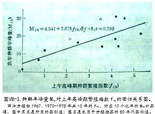以1970-1978年加上大暴发年(1967),共10年的10月中旬捕获雌性成体(体重≥12克)之平均胎仔数、怀孕率和繁殖指数3套数据,分别对应翌年M10计算相关系数(df=8),r值为0.711>r0.05、0.818>r0.01、0.799>r0.01,为显著和极显著正相关。繁殖指数代表种群繁殖强度,其算式为:ft=平均胎仔数×怀孕率=[怀有的胎仔总数/孕鼠数]×[孕鼠数/雌成鼠总数]=怀有的胎仔总数/雌成鼠总数。(式中,怀孕率去百分号,鼠和胎仔数单位为“只”,ft为t月份繁殖指数。)按此计算的各年10月中旬f10称为“高峰期繁殖指数”,它对次年M10之相关系数r值,依上述10年计算比怀孕率的r值略小,但在按不同年限计算时表现较稳定;因该指标综合了怀孕率和平均胎仔数双重信息,以它代表种群繁殖力水平更恰当。由图Ⅷ-3可见,M10对上年f10的回归线性关系很明显。