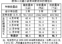 表Ⅷ-1是针对成体(按体重划定,♂≥11克,♀≥12克,主要是Ⅲ、Ⅳ 2个年龄组)作的统计。由该表可知,按年度总计看,低数量年的成体SR较大(46.7%),高、中数量年则都仅约43%;一年里又有季节性变化,中、低数量级年份,上半年鼠密度尚低,雄性比也就偏大,SR可达51.5%~59.6%,8月份开始下降,到10和11月中旬,成体雌雄比例几近2∶1;高数量年份,开春SR就比平常年低,之后总势头也是下降。这些情形总的显示,性比隨种群密度而变化,密度较低时,成体两性比例会较平衡,种群密度升高则雄性减少,但在高数量年份其季节性下降程度却又相对较小。