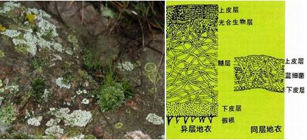 土壤微生物间的协同进化关系最为典型的例子就是地衣,它是真菌和苔藓植物的共生体,地衣靠真菌的菌丝吸收养料,靠苔藓植物的光合作用制造有机物。当环境条件仅有利于两者中的任何一方生长时,均不能合成地衣体,而且已建成的地衣也会发生不同程度的解体。因此可以看出地衣体并非真菌与藻类的简单加和,而是它们经过长期的相互作用演化而成的一种既不同于真菌又不同于藻类的生物,是真菌与藻类协同进化的产物。地衣物质的生物学作用主要有以下几个:抵抗多种微生物(尤其格兰氏阳性菌及各种真菌)的侵染;抑制与其争夺生存环境的植物种子或孢子的萌发、生长与发育;对取食它们的动物产生毒害作用。所有这些都是地衣为了适应其恶劣生境在漫长的进化过程中产生的 。