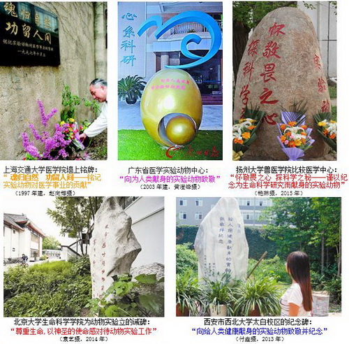 中国科学院之上海实验动物中心,世纪初就筹建的实验动物纪念碑于2013年元旦公开亮相(图1)。此前,上海交通大学医学院1997年就在校园围墙上钉了块黑底金字“铭记”牌,广东省医学实验动物中心2003年也在大门前建了“致敬”球;此后,北京、南京、西安、重庆、扬州…各地知名生命科学教研单位也都树起了这种纪念碑(图2)。