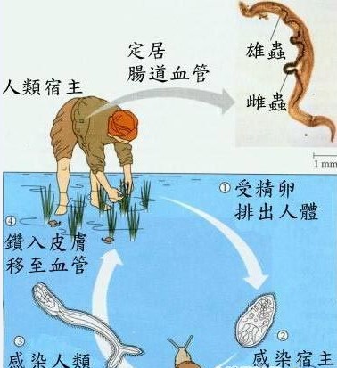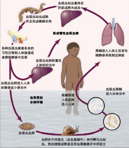 血吸虫也称裂体吸虫。血吸虫一共有五个形态:虫卵、毛蚴、尾蚴、童虫、成虫。血吸虫寄生于多数脊椎动物,卵穿过静脉壁进入膀胱,随尿排出。幼虫在中间宿主螺类体内发育。成熟幼虫通过皮肤或口进入终宿主体内。