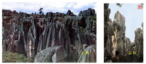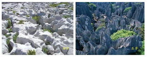 成片裸露、岩层厚度大的可溶性岩石节理裂隙和层面受地表水溶蚀、侵蚀,使岩石表面形成沟槽形态,凹槽称为喀斯特溶沟,沟槽间的突起称为石芽。在热带、亚热带地区,水热条件充沛,水的溶蚀性强,石芽在强烈的岩溶作用下生成一种特殊形态,形体高大,石芽之间的溶沟很深,沟坡垂直,坡壁上刻有平行垂直的凹槽,即石林。这类喀斯特景观的典型代表是著名的云南路南石林,石林相对高度一般20左右,大者可达50左右。