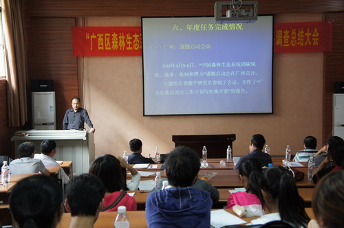 11月27日,中国科学院战略性先导科技专项项目“中国森林生态系统固碳现状、速率、机制和潜力”专题“广西区森林生态系统固碳现状、速率及潜力研究” 负责人,中国科学院环江喀斯特生态系统观测研究站常务副站长曾馥平研究员主持召开复查样地野外调查工作总结会。来自中科院亚热带农业生态研究所、广西大学林学院和广西林业勘测设计院等单位60余名科研人员参加会议,各调查组将野外调查任务完成情况作了详细总结和交流。